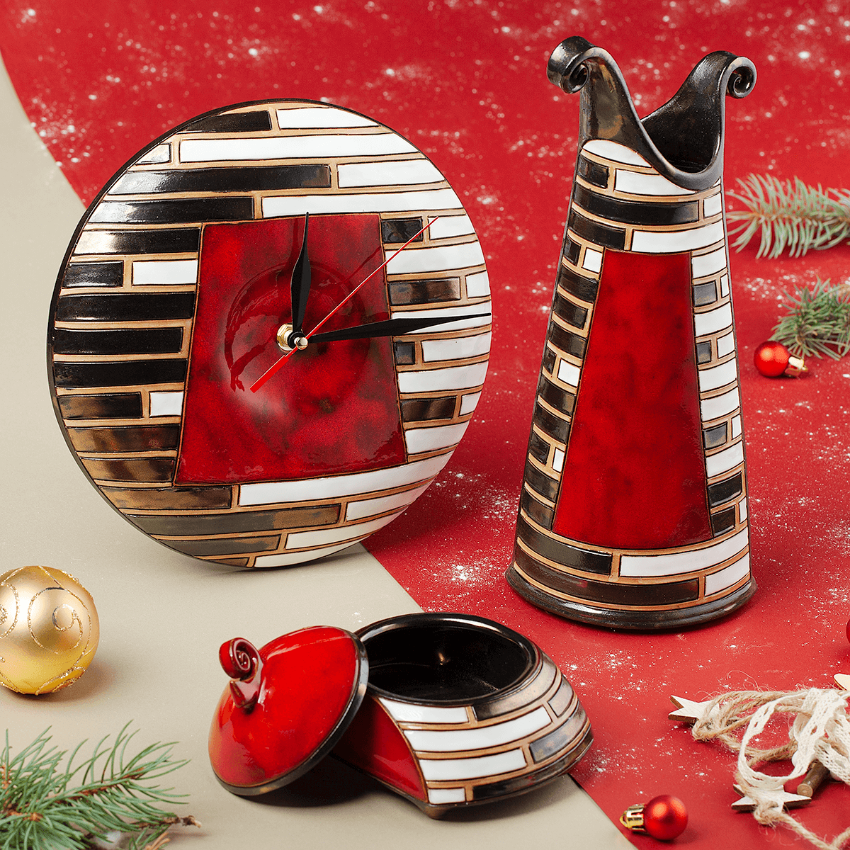 В избора от нашата продуктова гама сме съчетали три ръчно изработени керамични изделия, които ще стоят прекрасно във всеки дом-керамичен часовник, тънка ваза и кутийка за бижута.
