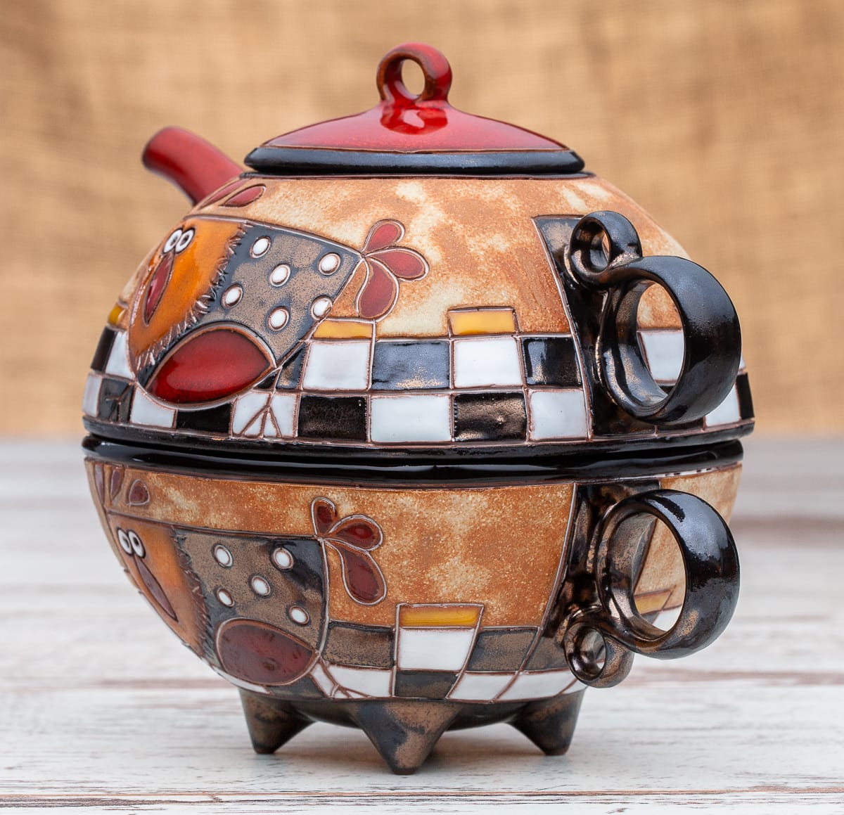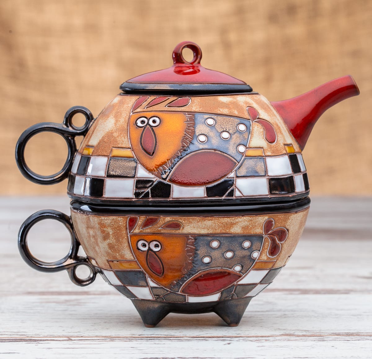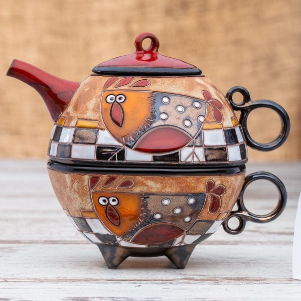 Гаппа Хендмейд има удоволствието да Ви предложи ръчно изработен комплект, който се състои от две части: керамичен чайник и керамична чаша. Двата продукта са изрисувани в съответния мотив, които могат да бъдат избирани според интериора във всеки дом.